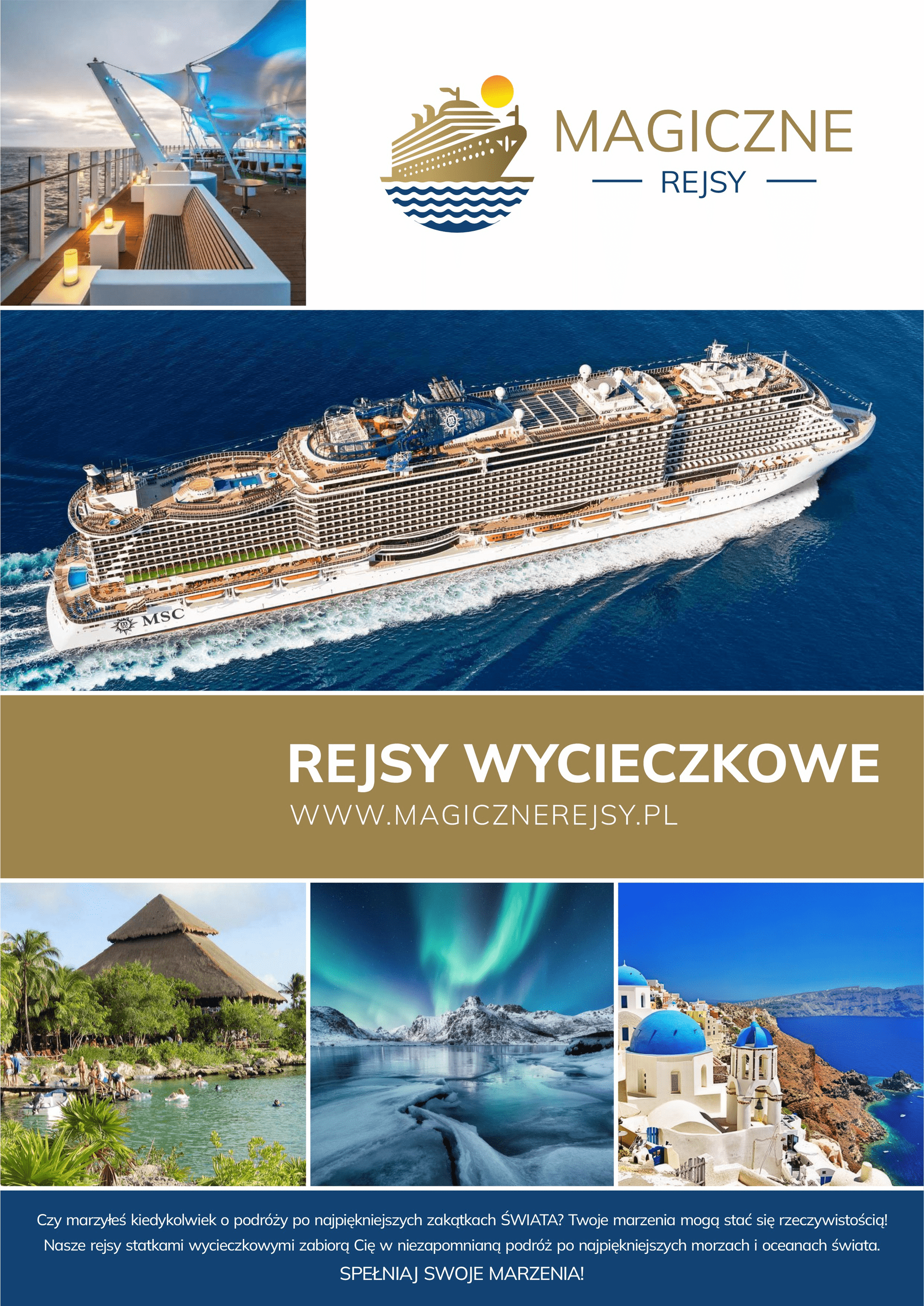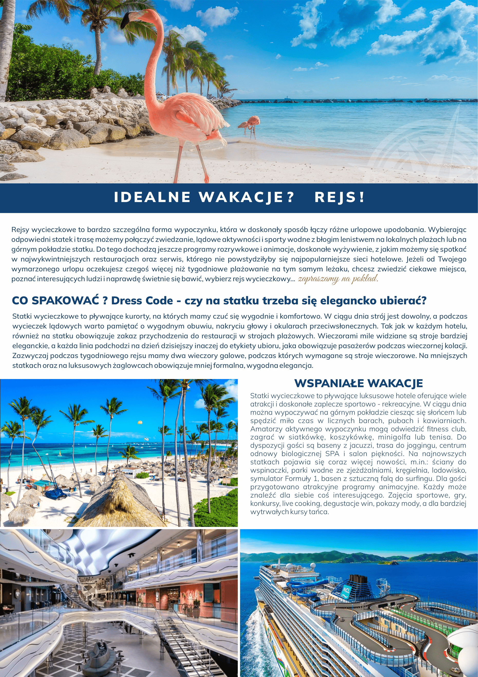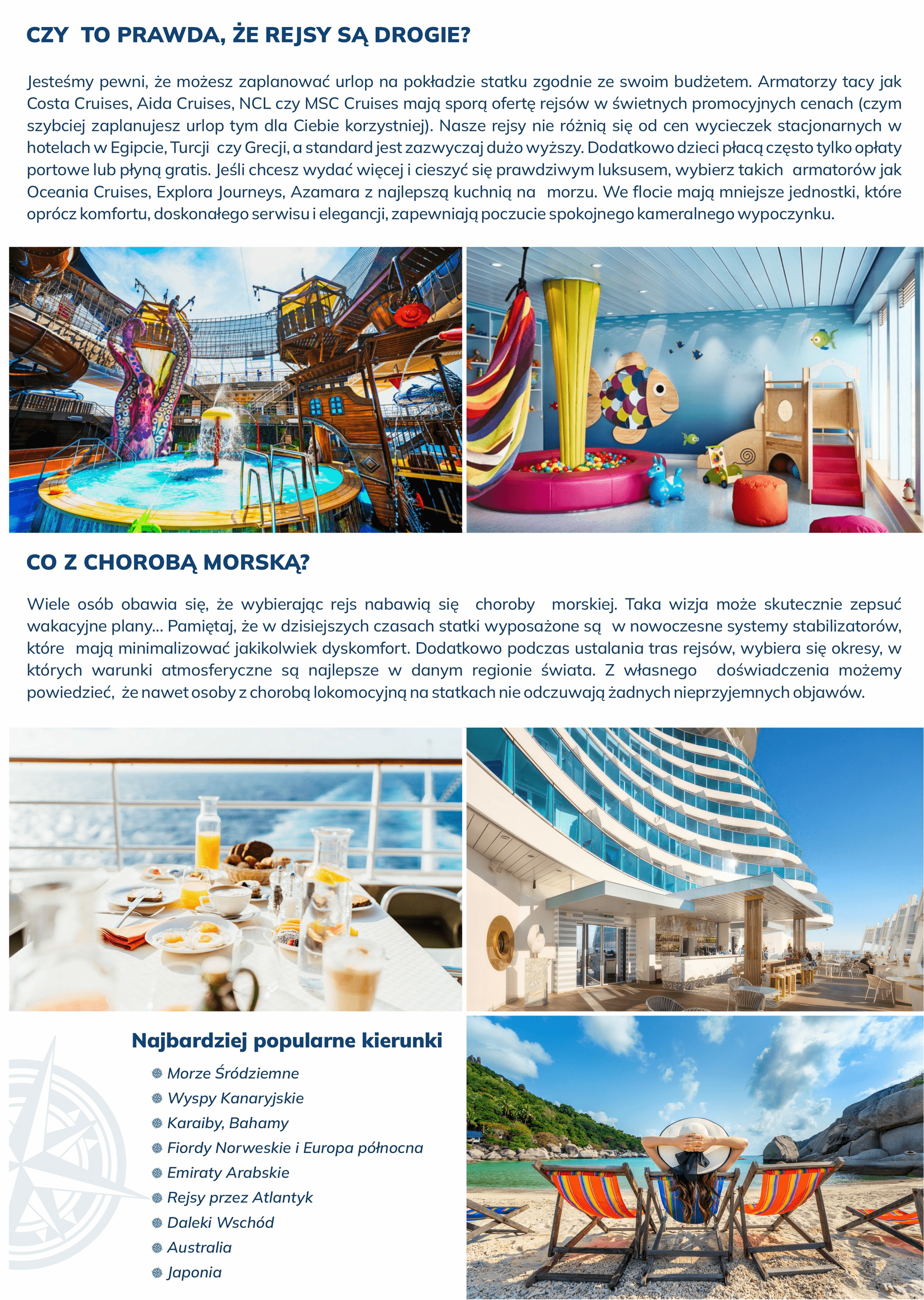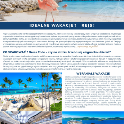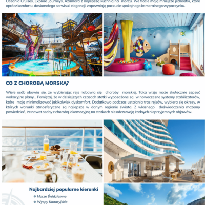 Podczas naszych rejsów możesz się cieszyć luksusowymi warunkami, doskonałą kuchnią i wspaniałymi atrakcjami na pokładzie. Wycieczkowce to pływające luksusowe hotele oferujące wiele atrakcji i doskonałe zaplecze sportowo – rekreacyjne.