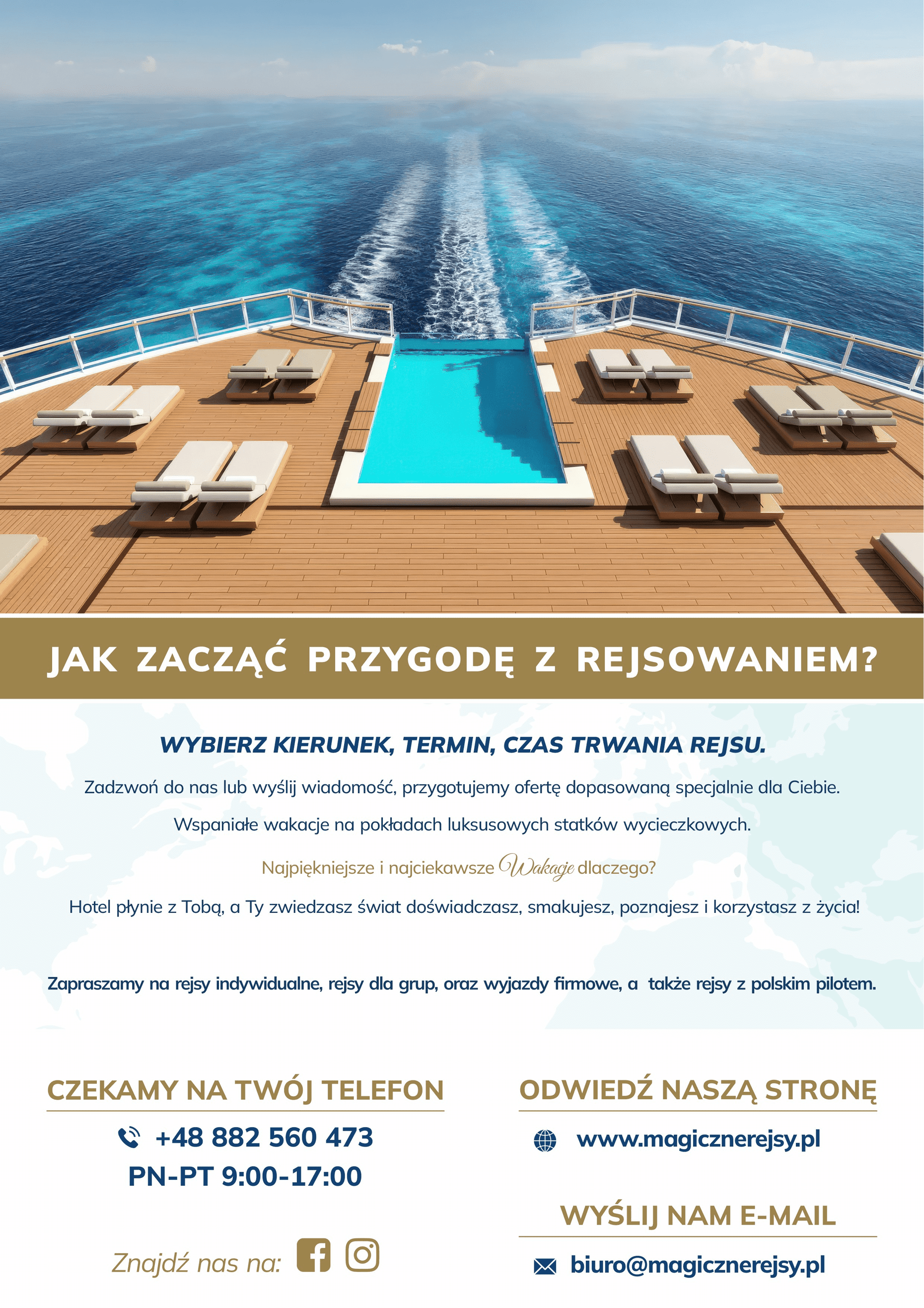 Wybierz kierunek rejsu, podaj liczbę uczestników rejsu – zadzwoń do nas lub wyślij wiadomość, a przygotujemy ofertę specjalną dla Ciebie – adekwatną do Twoich oczekiwań i budżetu.